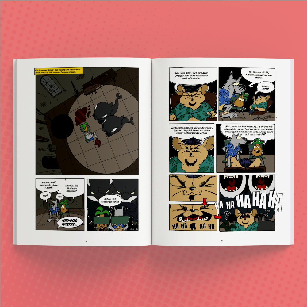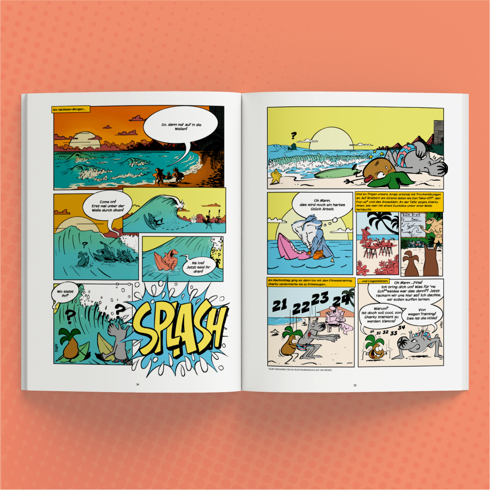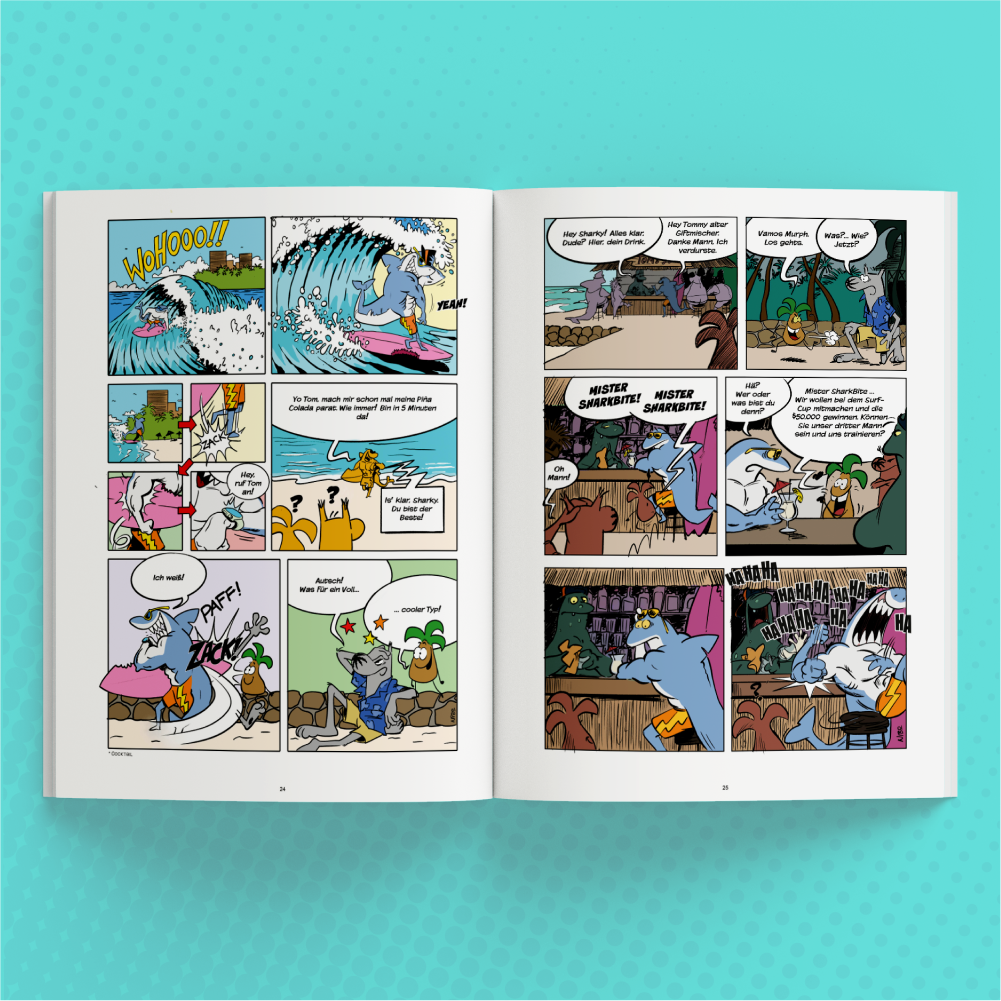 This comic adventure isn’t just about its hilarious characters—it’s packed with suspense and unique heroes! Page after page, young readers dive deeper into the exciting world of Piña “Loca”—the crazy pineapple—and his cheeky sidekick, Mad-Dog Murphy the dog. Together with the legendary SharkBite Robinson, they battle the evil mastermind, Mr. Big Kahuna. Perfect for anyone who loves humorous comics and gripping stories!